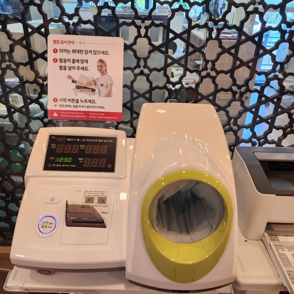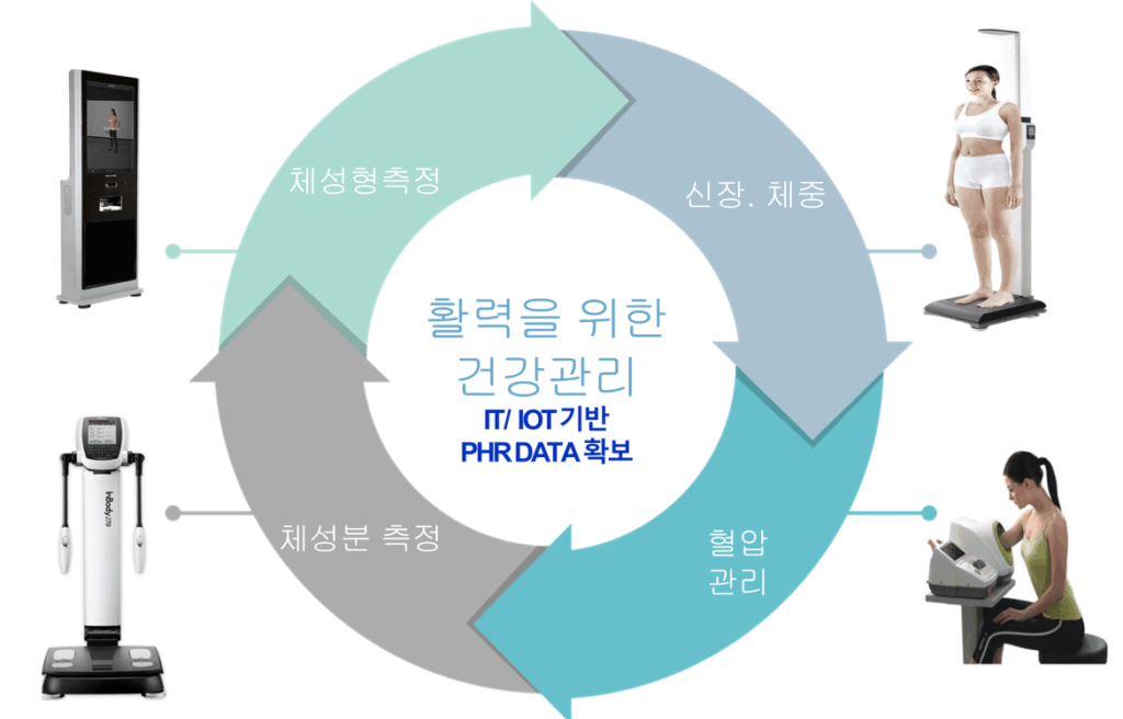 신장, 체중, 혈압 관리 뿐만 아니라 인바디 기계로 체성분을 측정하고, 버츄얼 메이트라는 체성형 측정 기계를 통해 신체의 불균형, 근골격계 질환을 파악하는 등 셀프 체형 분석이 가능합니다.