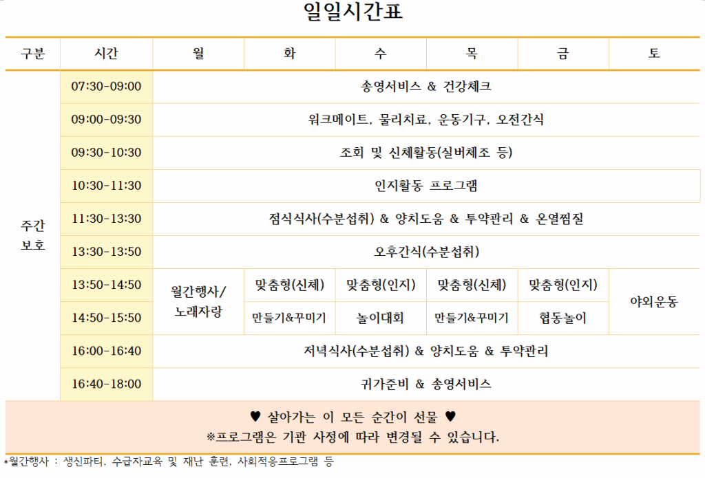 식사, 위생, 건강 관리까지 전문 인력이 함께하는 안전하고 믿음직한 낮 시간 돌봄 서비스를 제공합니다.